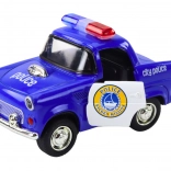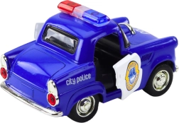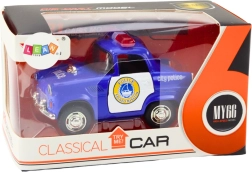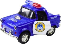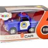 Den klassiske politibil i elegant blå er en perfekt replika af virkelige politibiler, som begejstrer både børn og voksne. Den har friktionstræk, der, når den trækkes tilbage, hurtigt kører fremad, hvilket muliggør realistiske politijagter eller patruljer.