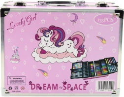 Kunstsæt i en udvidelig kuffert.Kunstsæt i en sammenklappelig kuffert udsmykket med et smukt enhjørningemotiv. Det er den ideelle gave til enhver lille kunstner, som vil blive taget med ind i en verden af fantasi og kreativitet!