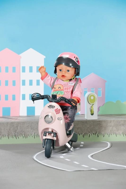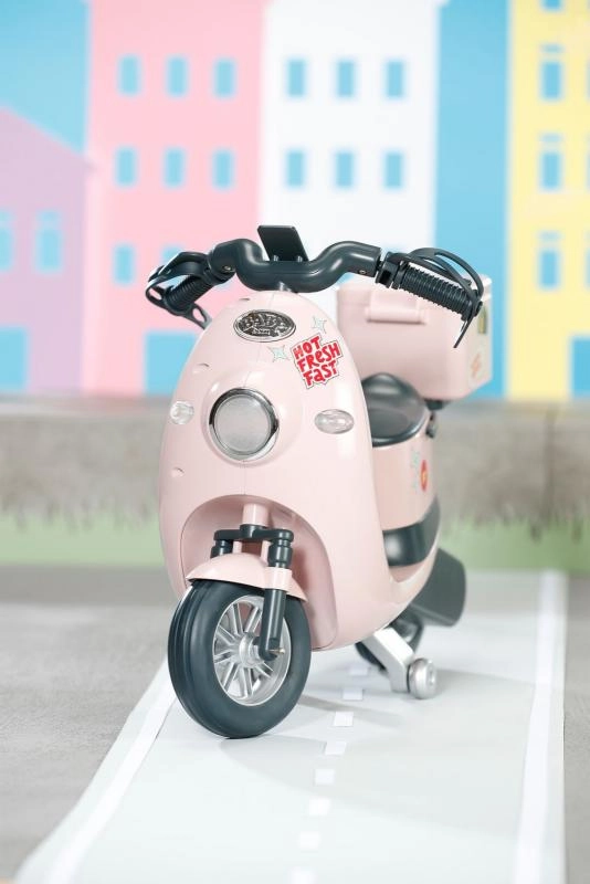 Denne lyserøde elektriske scooter er det perfekte supplement til kreativ leg med BABY born-dukken. Børn kan nemt styre kørselsretningen med fjernbetjeningen, mens realistiske elementer som lys, støttefod og funktionelle detaljer stimulerer fantasien og finmotorikken.