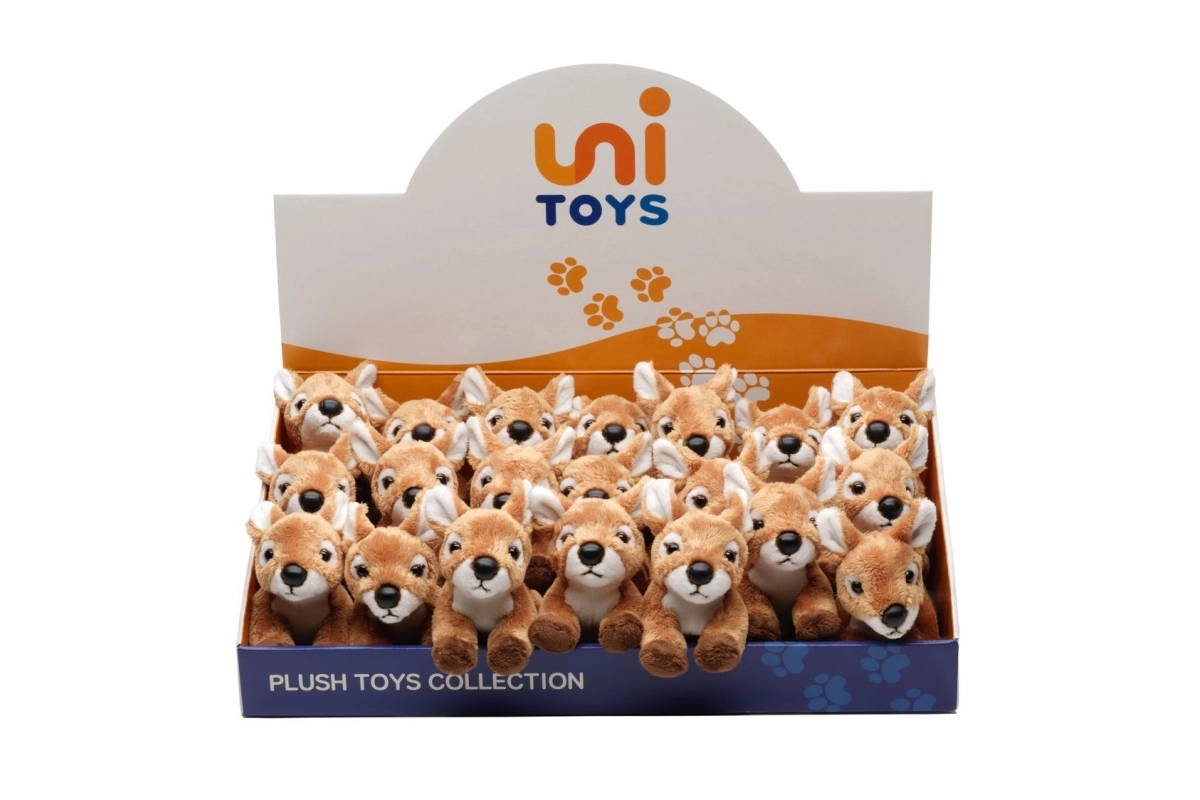 Plysbamse i form af en hjortekalv, ca. 13 x 10 x 5 cm. Alder 3+