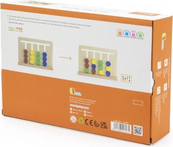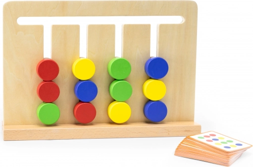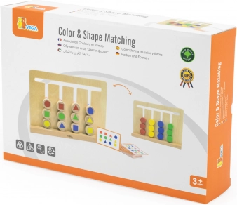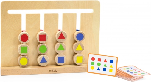 Træbaseret logikspil fra VIGA lærer børn fra 3 år at genkende farver og former, planlægge trin og koncentrere sig. På 4 baner flytter børn 12 dobbeltsidede klodser efter 16 dobbeltsidede kort. To sværhedsgrader (farver → former) sikrer langvarig og meningsfuld leg i Montessori-ånden.