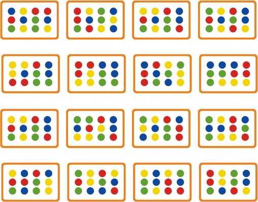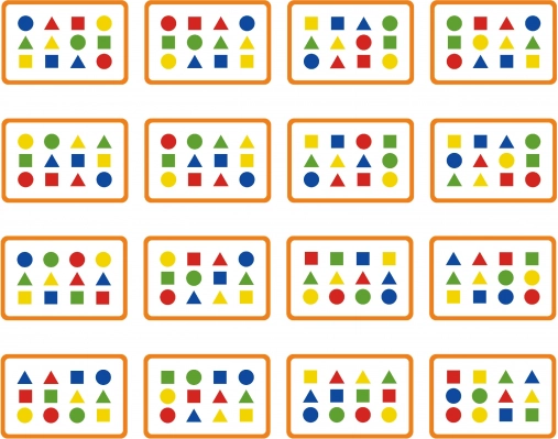 - 12 dobbeltsidede klodser – farver på den ene side, former på den anden