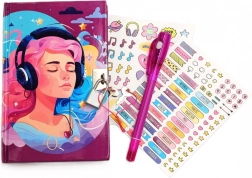 Den magiske lys-musikdagbog indeholder 40 linjerede sider. Den har hårde omslag pyntet med LED-lys og lukkes med en hængelås. Medfølger gør 2 ark klistermærker og en pen med to spidser. Den ene har almindeligt blæk, den anden usynligt blæk, som kun kan ses ved hjælp af den særlige "lommelygte" i pennen.