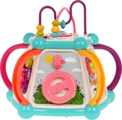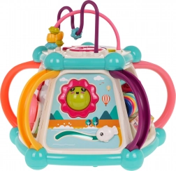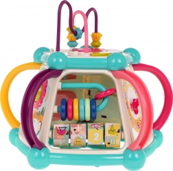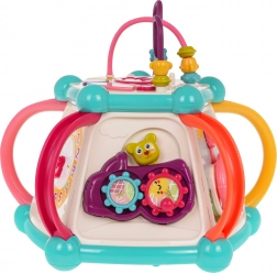 Denne farverige, multifunktionelle terning er lavet af kvalitets- og sikker plast og er ideel til de første opdagelser af verden. Syv ledeflader tilbyder varierede aktiviteter: toppanel med vendespil, tostadet lydstyrkekontrol og klaver med lyde fra hund, kat, får og and, sideflader med kugleramme, ur med visere, tandhjul og en bjørn, rat med lille bil samt en sjov fisk med sol. Undersiden rummer en formsorteringsåbning og 6 farvede klodser.