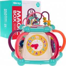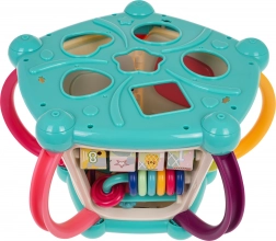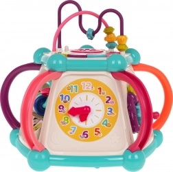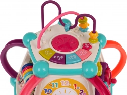 Takket være lys- og lydeffekter (melodier, tromme, dyrelyde, raslen og klik ved bevægelse af elementer) stimulerer legetøjet sanserne og motiverer til gentagen udforskning. Børnene træner finmotorik, logisk tænkning, genkendelse af former, farver og tal samt tidsfornemmelse. En ideel gave, der vokser med barnet og tilbyder masser af lege-muligheder.