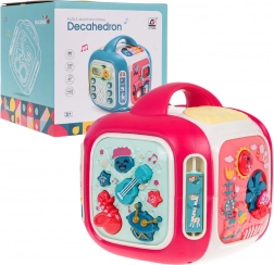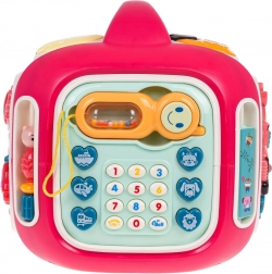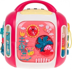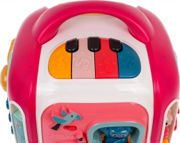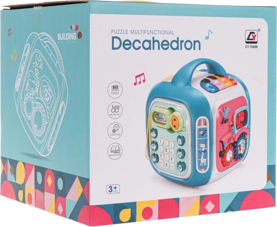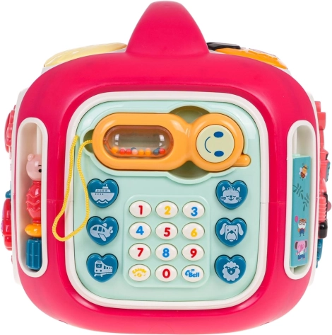 Hver side af boksen tilbyder en anden måde at udforske på: en musikpanel med guitar, saxofon og tromme med lyseffekter, en aftagelig “telefon” med tallene 0–9 og knapper med dyr og transportmidler, en side med en lille traktor og tandhjul til at udvikle koordination samt en side med sol og vindmølle til afspilning af melodier. Øverst er der et følsomt lille klaver med 3 tilstande (skala, tilfældig afspilning, musiktilstand) og en lydmixer.