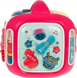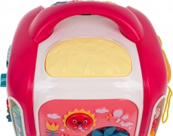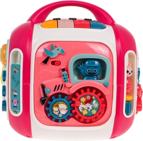 Legetøjet er lavet af kvalitetsplast i livlige farver og tilbyder rige lydeffekter (melodier, sange, dyre- og køretøjslyde, tælling, klik fra gear) og lyseffekter (bagbelyst tromme og tangenter). Sidebuer med roterende elementer styrker fingerfærdighed og stimulerer børns nysgerrighed.