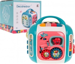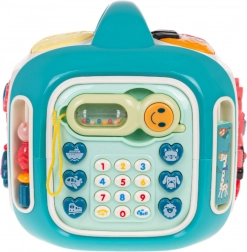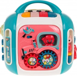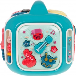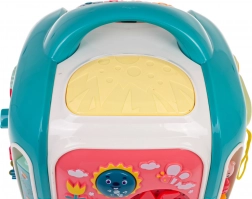 Den interaktive terning er designet til både leg og læring. Børn udforsker farver, former, navne på dyr og transportmidler, træner fingrene på roterende elementer og opdager forskellige melodier og lyde. Topanel med klaver tilbyder 3 tilstande og følsomme tangenter for let spil.
