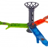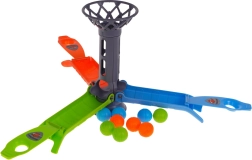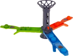 Spillet Hvem Først giver op til tre spillere mulighed for at konkurrere mod hinanden. Hver spiller vælger sin base (grøn, blå, orange) og får tre kugler i den tilsvarende farve. Målet er at skyde kuglerne, ramme tårnet og så hurtigt som muligt placere alle sine kugler på spillebasen.