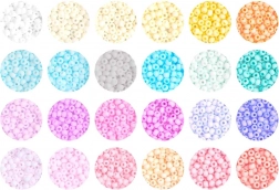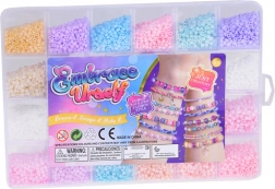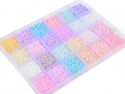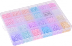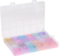 Indeholder 24 forskellige pastelfarver af perler: pink, lilla, blå, beige, grøn, hvid og gul. De er opbevaret i en gennemsigtig, aflång beholder, som er praktisk opdelt i rum. Det forhindrer blanding af perler og gør organiseringen nemmere.