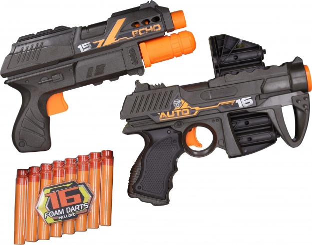 Sjovt sæt med to skumblastere til actionlege både indenfor og udenfor. Indeholder pistolen Auto Scout med magasin til 6 projektiler og pistolen Echo‑1 med pumpeladning. I pakken er der 16 skumprojektiler, rækkevidde op til 15,2 m og enkel aftrækkerbetjening for sikker og hurtig underholdning.