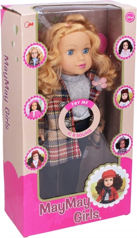Køb dukken med frakke og lydeffekter, 48 cm, udstyret med kam og batterier til interaktiv leg.