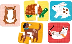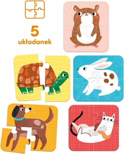 Disse sjove puslespil introducerer børn til velkendte kæledyr. Hvert firebrikkers puslespil forestiller et dyr og styrker både finmotorik og opmærksomhed.