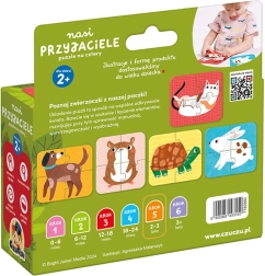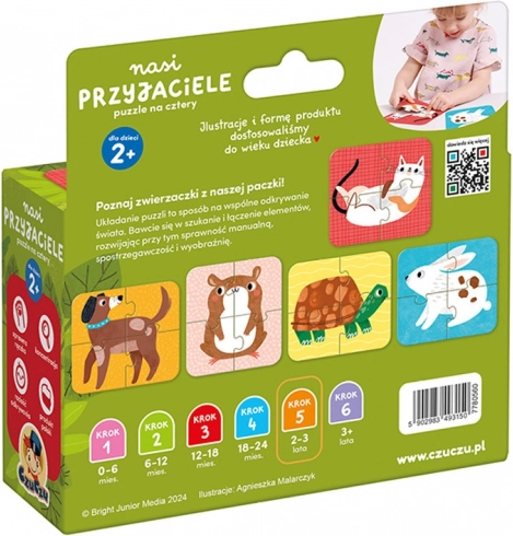 Oplev det lærerige sæt puslespil Vores Venner, som indeholder 5 firebrikkers puslespil med farvede baggrunde for lettere samling: