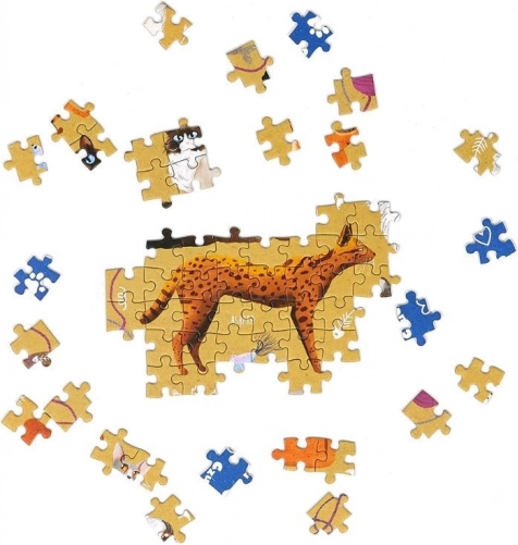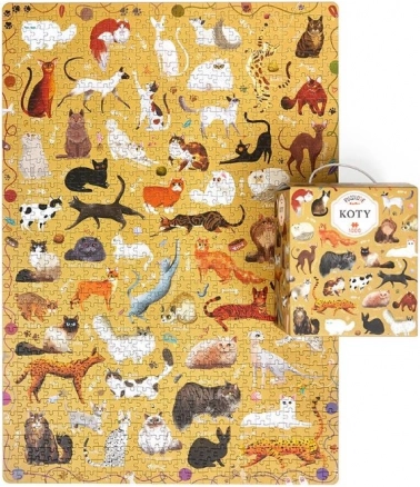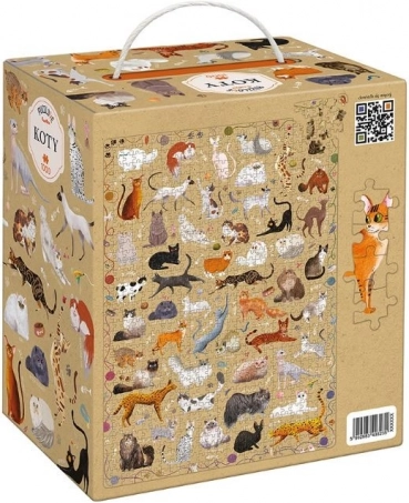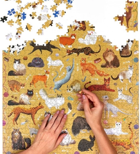 En original illustration af katte af mange forskellige racer. Puslespillet vil glæde både voksne og større børn, det giver en beroligende oplevelse og træner koncentrationen. Takket være den omhyggelige forarbejdning passer brikkerne godt sammen, og motivet kommer til sin ret i hver detalje.