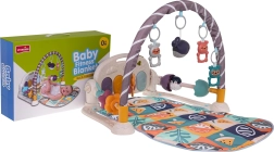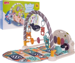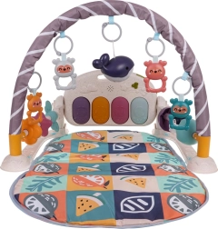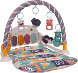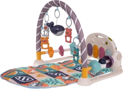 Klaveret med 4 bagbelyste tangenter og melodi-knap kan vippes i flere positioner, tages ud af tæppet og takket være håndtaget tages med på farten. Buen byder på 4 ophængte raslende bamser og en lysende delfin, mens perle-sandløbselementer i siderne styrker finmotorikken. Lydstyrken kan nemt reguleres.