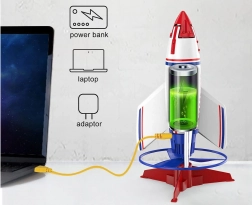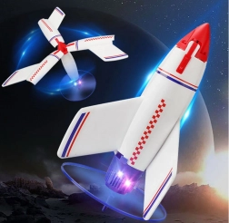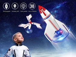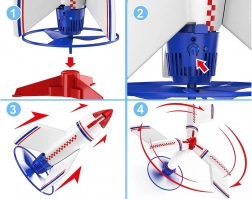 Denne lette og robuste raket kombinerer en plastikramme med blødt skum for mere sikker brug. Under nedstigning åbner vingerne sig automatisk og fungerer som en faldskærm, der sikrer en stabil og blød landing. Start er nem – placer raketten på startplatformen og affyr den med en knap eller fjernbetjeningen.