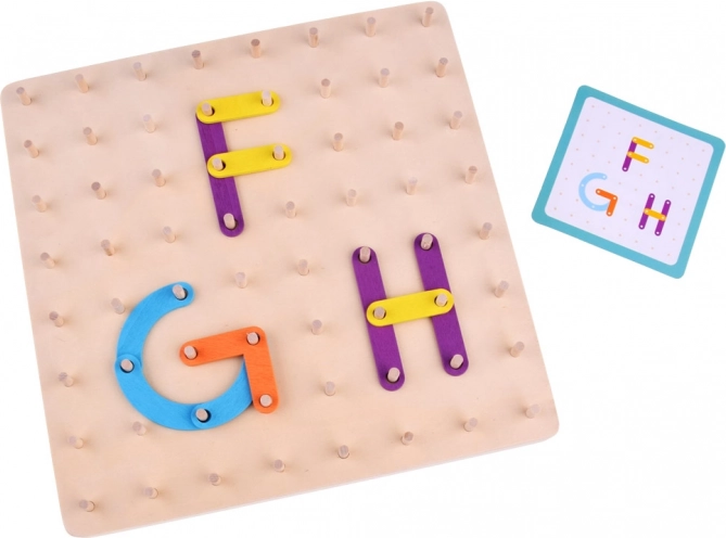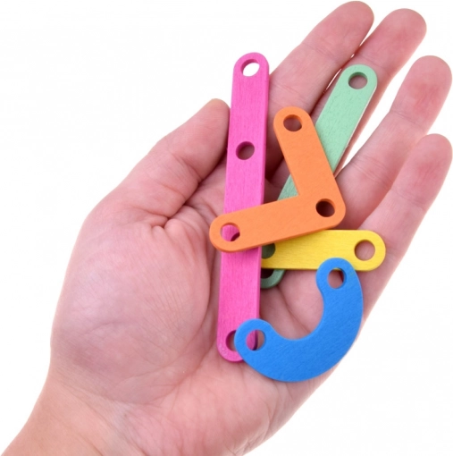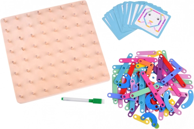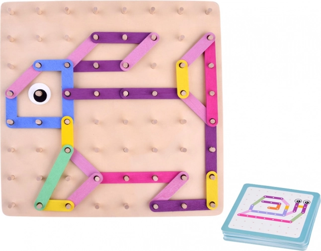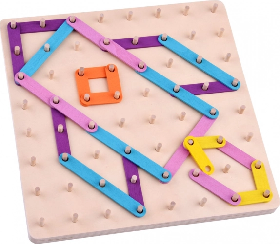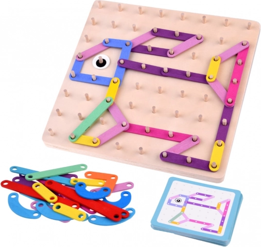 Farvede pinde i forskellige længder placeres på en plade med knopper efter skabeloner eller fri fantasi. En fantastisk træning af finmotorik og rumlig forestillingsevne.