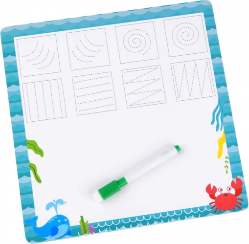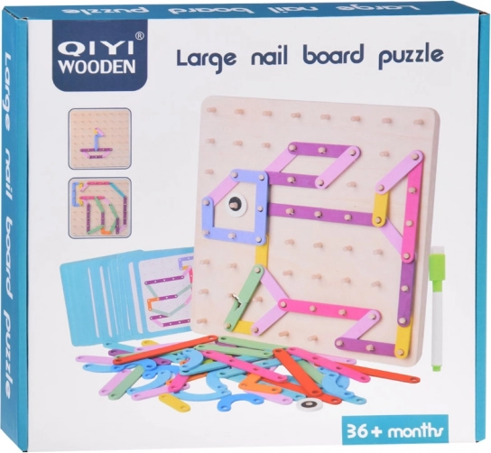 Dette smarte sæt kombinerer en mosaik-pegboard-tavle med farvede træpinde og en tør-af-skriveflade. På den ene side sætter børn pinde i forskellige længder og farver i træknopperne og skaber billeder efter kortene eller egne designs. På den anden side af tavlen kan de træne grafomotorik, skrivning og de første tegninger med den medfølgende tør-af-tusch.