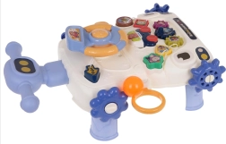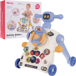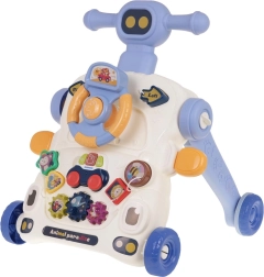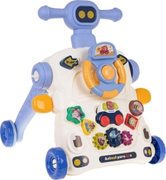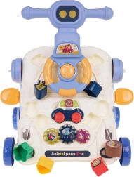 Denne multifunktionelle gåvogn glæder både forældre og børn: den fungerer som støtte ved de første skridt og samtidig som et aktivitetsbord til legende udvikling. Panelet byder på rat med piftefunktion, gear, formesorterer og en lille kurv til at kaste bold i – alt designet til at styrke koordination, koncentration og motoriske færdigheder.