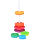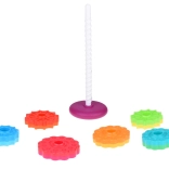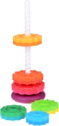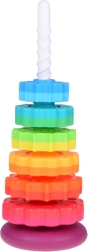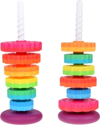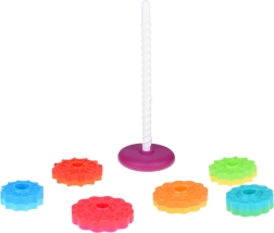 Dette farverige spiraltårn fanger børns opmærksomhed med klare farver og den glidende bevægelse af ringene ned ad spiralstangen. Under legen udvikler børn naturligt greb, bevægelsespræcision og lærer at skelne mellem størrelser. Takket være den holdbare plast og den stabile base er legetøjet sikkert og intuitivt.