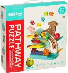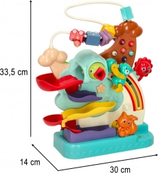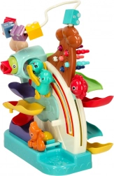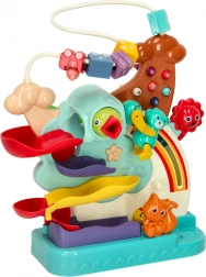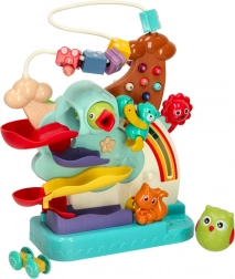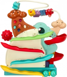 Farvede kugler og en lille bil suser ned ad to niveauer af baner, som styrker koncentration og koordination. Børn elsker at se kuglerne falde og prøve nye kombinationer.