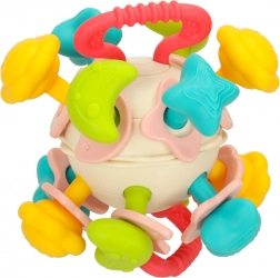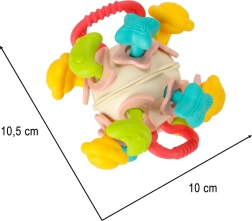 Denne lette og let at gribe sensoriske legetøjsbold kombinerer plast- og silikoneelementer, der inviterer børn til at udforske. Kontrastfarver og flere overfladestrukturer stimulerer syn og berøring, mens den blide raslelyd udvikler høresansen.