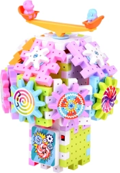 Byggesættet indeholder tandhjul og små skovle med dyr, som kan dreje, hvilket udvikler koordination og problemløsningsevner.