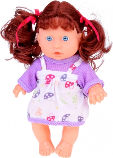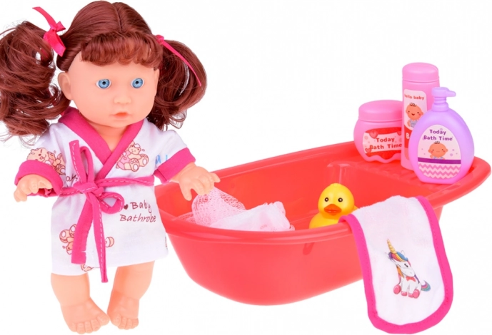 Denne interaktive babydukke med blå øjne og langt kastanjebrunt hår styrker børns fantasi og omsorgsevner. Med blød gummihoved og plastkrop føles den behagelig og realistisk under legen. Børn kan gøre klar til bad i badekarret med vand, give dukken badekåbe på og tage sig af daglige rutiner.