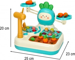 Sættet indeholder en stabil base med integrerede spil: vejning og balance, banke-muldvarpe, fiskeri og udtrækning af gulerødder. De farverige elementer indbyder til opdagelse og fremmer læring gennem leg.