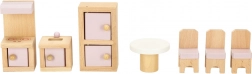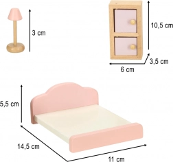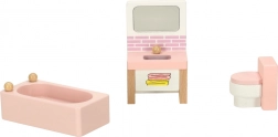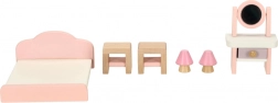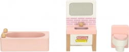 Træmøbler til dukkehus – stue, soveværelse, badeværelse og køkken, pink