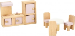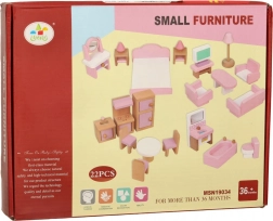 Stilfuldt sæt træmøbler til dukkehus, der indretter stue, soveværelse, badeværelse og køkken. Kvalitets naturligt træ, sikre farver i pink og hvid, i alt 22 dele. Understøtter kreativitet, rumlig forståelse og læring gennem leg fra 3 år.