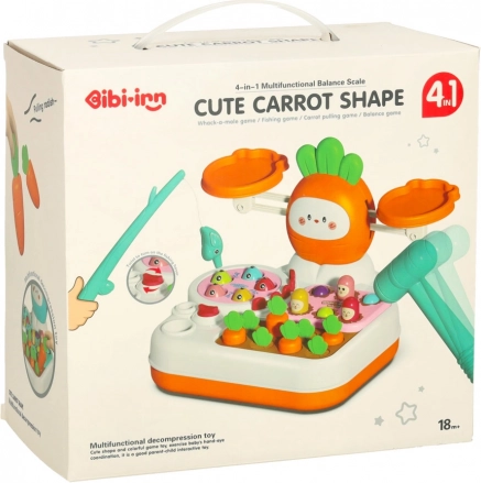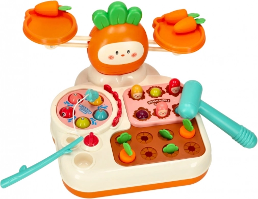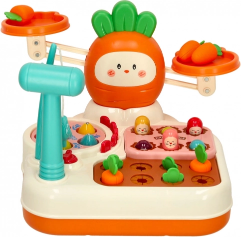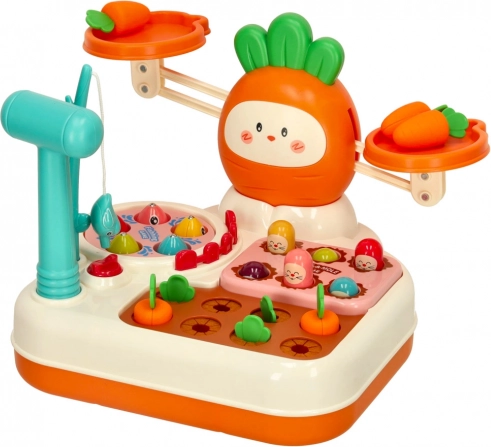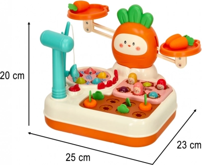 Denne interaktive pakke gør læring til leg. Børn kan afprøve balance og vægtsammenligning på skålvægten, træne reaktionsevne og præcision ved at fange fisk, styrke grebsstyrke og hurtige reaktioner i whack-a-mole med en plastikhammers, samt udvikle tålmodighed og logisk tænkning ved at plante og samle gulerødder.