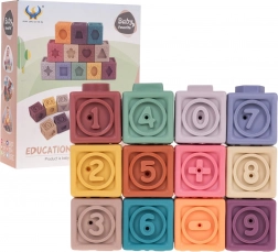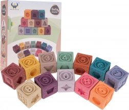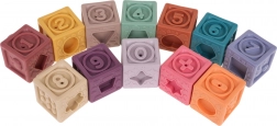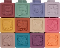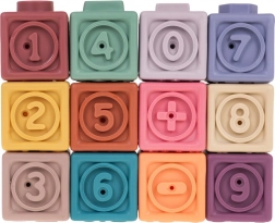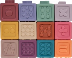 Sættet indeholder 12 forskellige farvede silikoneklodser, der stimulerer barnets syn og kreativitet.