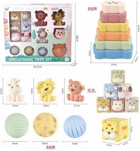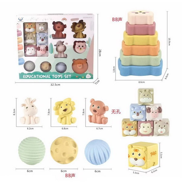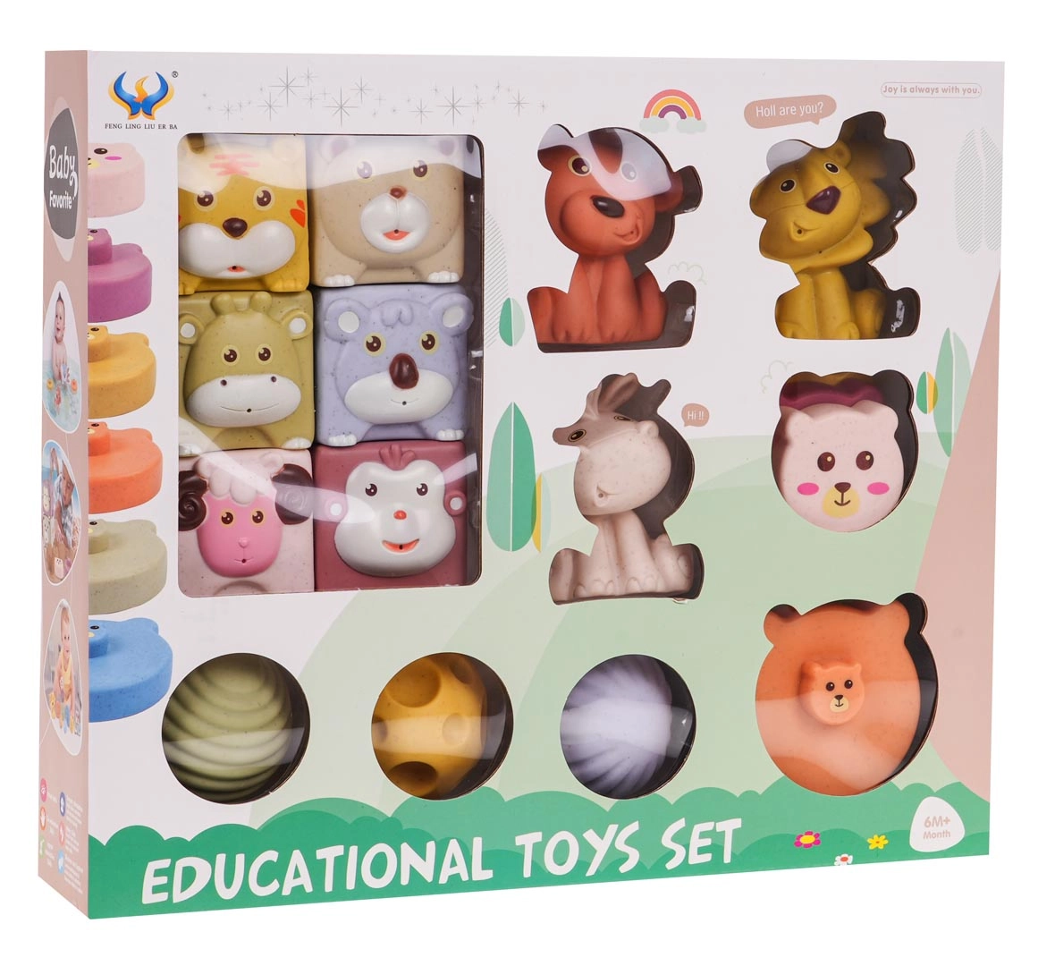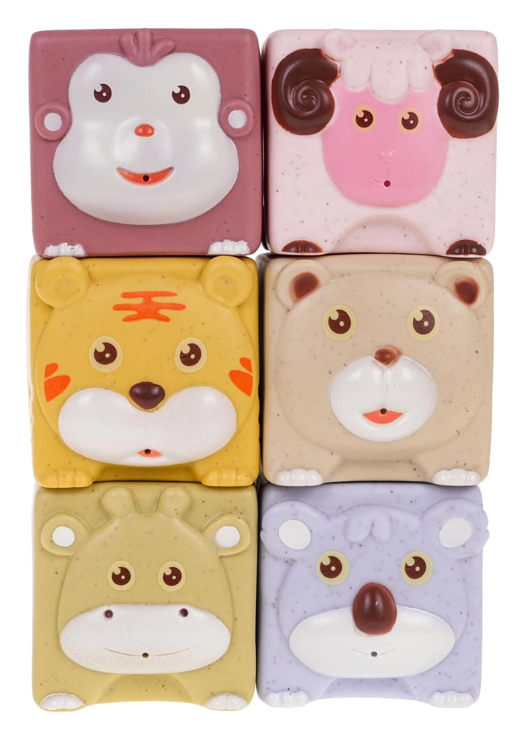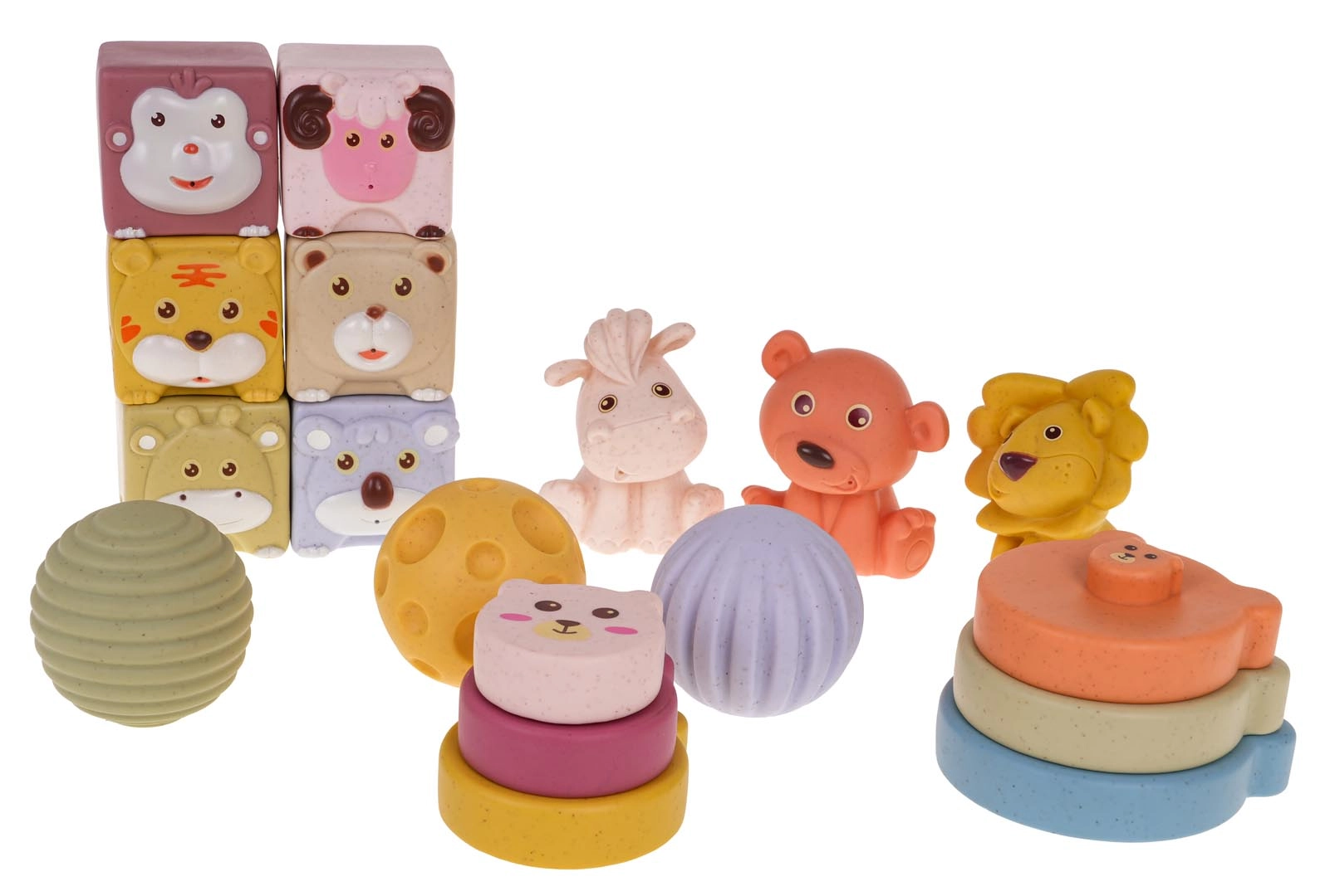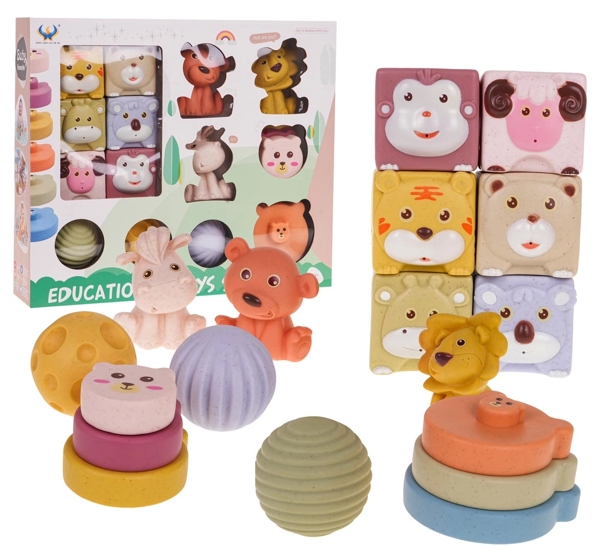 - 6 klodser med dyr: abe, får, tiger, bjørn, hjort, koala, hver med forskellig tekstur og farve.