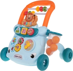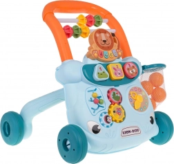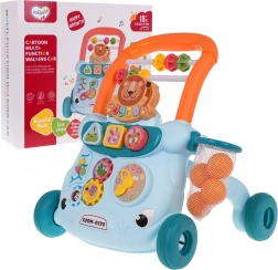 Den multifunktionelle gåvogn og ride-on i blå ledsager børn sikkert og legende gennem deres første skridt. Den robuste krop kan for øget stabilitet tynges ned med vand eller sand, hjulene har gummibane og en bred hjulafstand for mere sikker styring. Det interaktive panel udvikler finmotorik, logik og tidsforståelse takket være uret med bevægelige visere, tandhjul og kuglelabyrint.