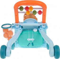 Øverst findes en formsorter (3 former), en kugleramme med 6 perler og et aftageligt klaver med dyrelyde og melodier. På siden er der en praktisk kurv til bolde, og i pakken finder du hele 4 bolde til ekstra leg og træning af kast.