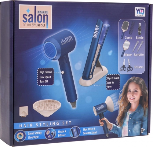 Interaktivt, veludstyret frisørsæt med hårtørrer med udskiftelige dyser og batteridrevet glattejern er beregnet til børn fra 3 år. Sættet indeholder et bredt udvalg af frisørværktøj, herunder hårtørrer, glattejern, saks, kamme og andet tilbehør. Hårtørreren blæser luft. Den har totrins regulering af luftstrømmen og afgiver lyde som en rigtig under tørring. Glattejernet har lyseffekter, og lyde ledsager udretningen af håret. Hårtørreren drives af 3 x AAA 1,5 V batterier (medfølger ikke), glattejernet af 2 x AAA 1,5 V batterier (medfølger ikke). .. Sættets funktioner: . - egnet til børn over 3 år, .- fremstillet af materialer af højeste kvalitet, .- hårtørrer med udskiftelige mundstykker (diffuser og koncentratormundstykke), .- hårtørreren blæser luft, .- hårtørreren har totrins indstilling af luftstrømmen, .- hårtørreren afgiver lyde under tørring, .- glattejernet har skyder til at lukke og åbne, .- glattejernet har lys, .- glattejernet afgiver lyde, der er karakteristiske for udretning af hår, .- praktisk holder til hårtørrer eller glattejern. . |