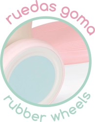 Gummibelagte hjul sikrer stille drift og godt vejgreb. Den stabile firehjulede konstruktion støtter balancen hos begyndere.