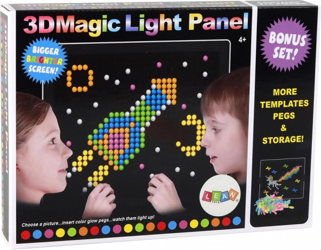 Oplev kreativ underholdning med en magisk lysende 3D-tavle og et sæt med 276 farvede knapper. Skab lysende billeder og 3D-mønstre, og udvikl finmotorik, rumlig forestillingsevne og kreativitet. Velegnet til børn fra 4 år, med skabeloner til en nem start.
