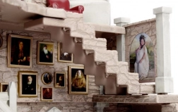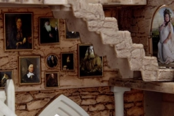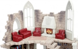 En lille model af rummet med oldgamle sten og gotiske buevinduer. Røde lænestole omkring pejsen fremhæver den gotiske stil.
