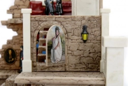 Stenminiature af slottet med søjler og en lille udendørs lampe, velegnet til udstilling eller leg.