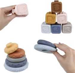 Sættet indeholder forskellige ringe og terninger til at bygge og stable, hvilket fremmer børns kreative og logiske tænkning.