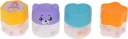 Fire klodser med kugler indeni rasler behageligt, motiverer til gentagen indsætning og lærer barnet at genkende former og farver.