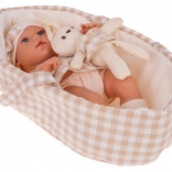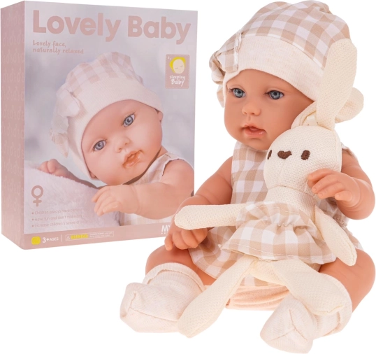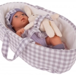 Dette elegante sæt indeholder alt, hvad børn behøver for at passe deres baby: en detaljeret dukke i matchende tøj, en blød plyskanin og en tekstilkurv med håndtag til transport. Kvalitetsmaterialer og sikker udførelse sikrer lang og glædesfyldt leg.