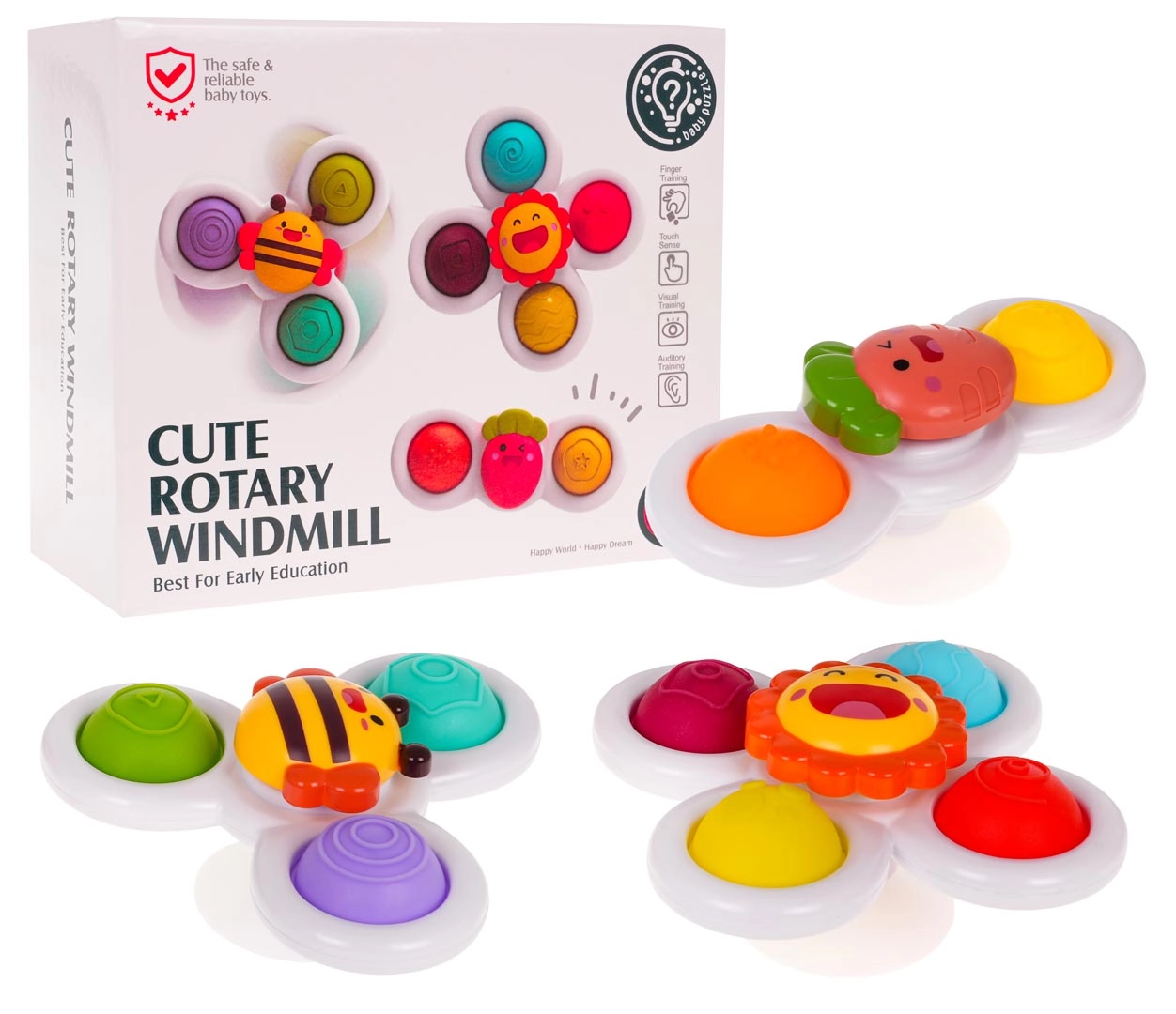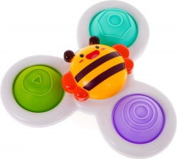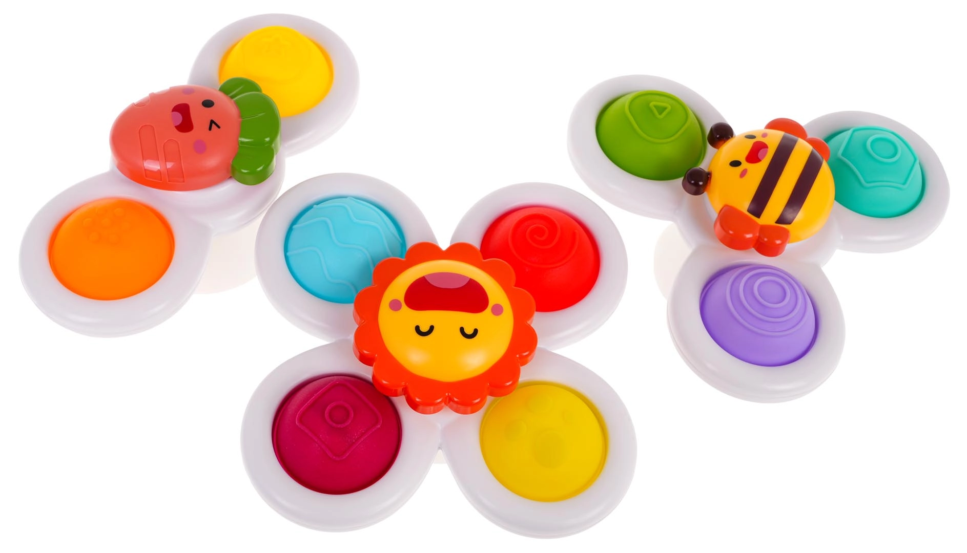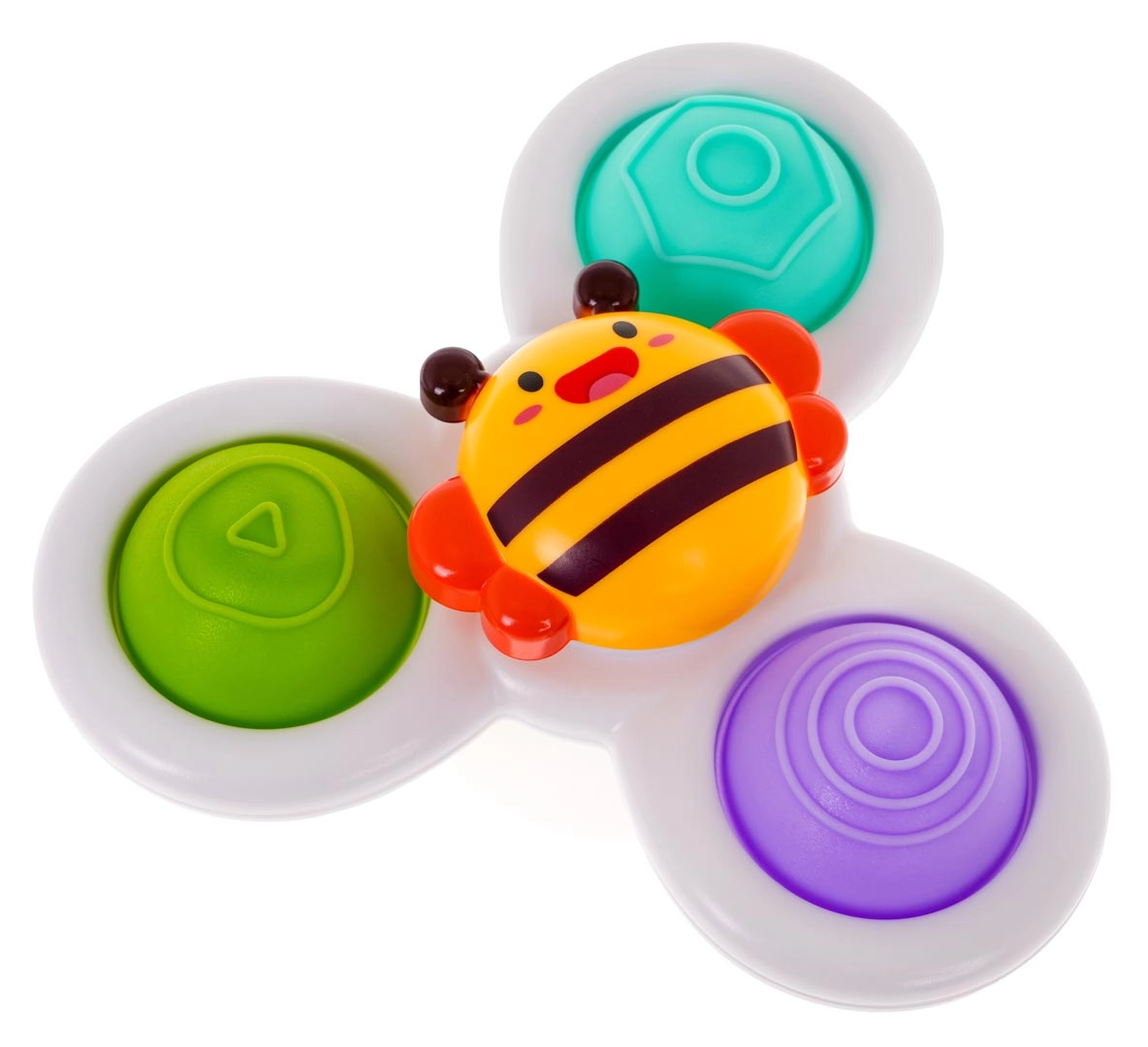 Tre søde motiver – sol, bi og gulerod – forener legende design med praktiske funktioner til barnets udvikling. Den stærke sugekop på bagsiden gør det muligt at fastgøre legetøjet på forskellige glatte overflader, mens de holdbare lejer sikrer en langvarig og jævn spin. Takket være det vandafvisende design egner spinnerne sig også perfekt til badet.