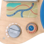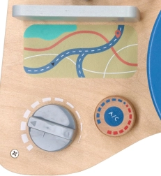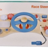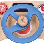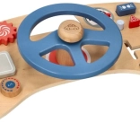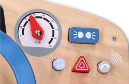 Trærattet fungerer uden behov for batterier og giver børn autentiske lydeffekter takket være det pibende horn og den kliklydende knap.