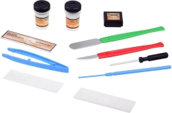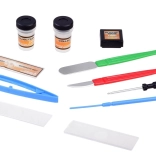 - Forberedt objektglas, 2× objektglas til præparat, 2× bæger med låg, prøveboks, pincet, spartel, skalpel, nål, skruetrækker, vejledning