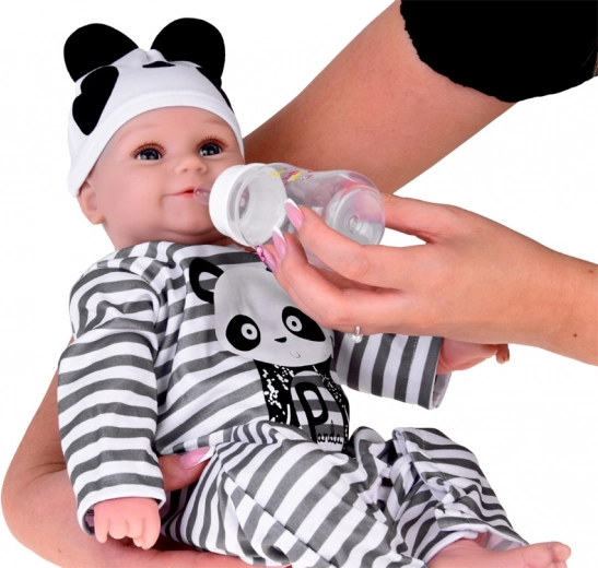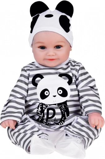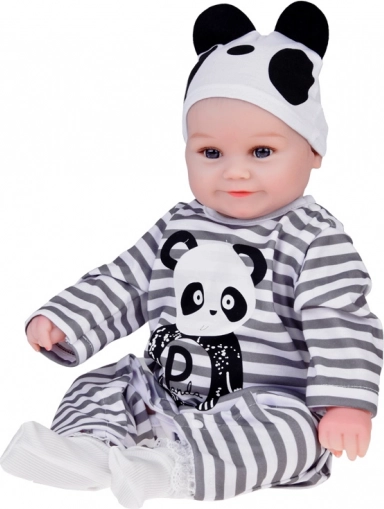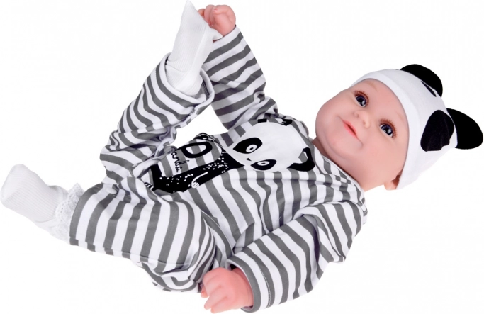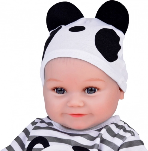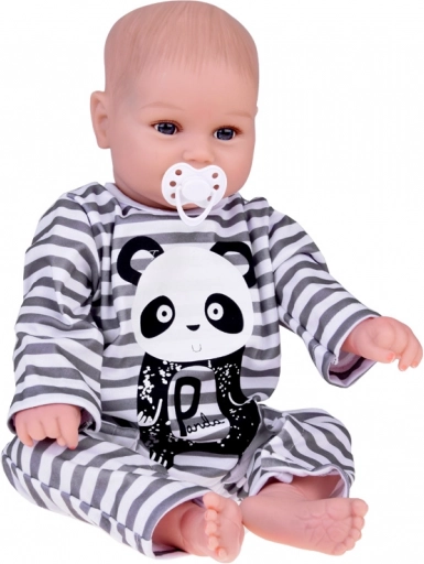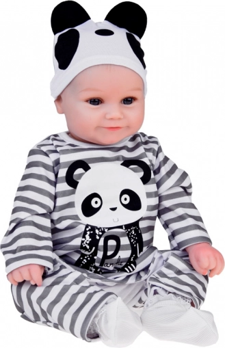Sød blød dukke dreng er klædt i en stribet heldragt med panda-motiv og er ideel for enhver lille omsorgsperson. Denne realistiske dukke på 45 cm er en fantastisk legekammerat takket være de bløde materialer og den omhyggelige udførelse.