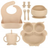 Komplet silikonesæt til barnets første selvstændige måltider. Indeholder tallerken formet som en ugle, skål, kop med sugerør, hagesmæk og 2 sæt bestik. Fremstillet af sikker fødevaregodkendt silikone, med skridsikker sugekop på skål og tallerken, ergonomisk bestik til små hænder og hagesmæk med lomme for mindre rod.